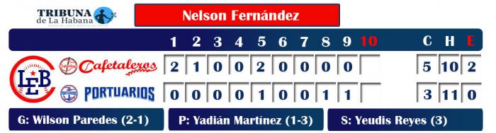 Por último, en el Nelson Fernández de San José de las Lajas, los visitantes Cafetaleros batieron 5-3 a los Portuarios, un equipo que solo ha podido ganar tres desafíos de los 17 que ha disputado hasta el momento.