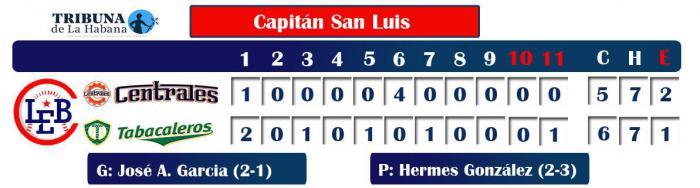 En el otro partido de la jornada, un pelotazo con las bases llenas sirvió para que los Tabacaleros dejaran tendidos en el césped del Capitán San Luis a los Centrales con pizarra de 6-5, en un peleado partido que se extendió a 11 episodios.