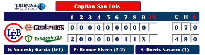 Apoyados en el brazo de Yuniesky Garcia, Tabacaleros venció a Centrales en los predios del Capitán San Luis con marcador de 4-0, para colocarse a solo media rayita de la segunda plaza del campeonato.