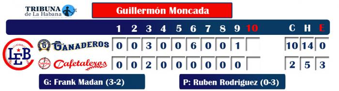 Dayán Garcia pegó doble y triple para remolcar una carrera, Juan Carlos Arencibia (3-1) y Yaserr Julio González (4-1) trajeron una cada uno, y Osbel Pacheco se fue de 4-2.