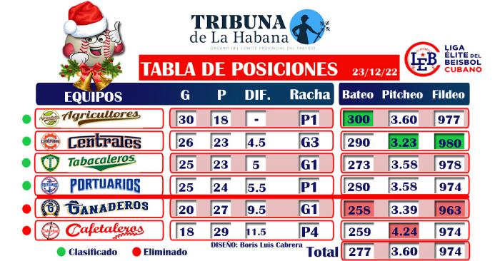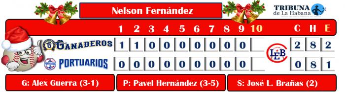 Por último, unos Ganaderos ya sin opciones, batieron 2-0 a los Portuarios en el Nelson Fernández de San José de las Lajas, para bajarlos hasta el cuarto lugar de la liga.