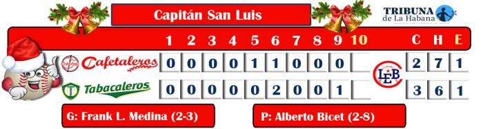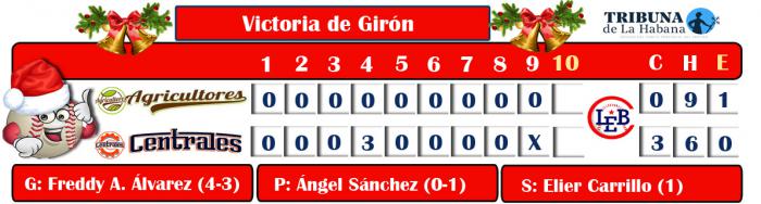 Osbel Pacheco (2-0) con un elevado de sacrificio, y Dayán García (4-1) con un tubey, remolcaron las otras carreras por los ganadores, en una tanda donde Luis Pablo Acosta fue el único que logró ligar un par de inatrapables.