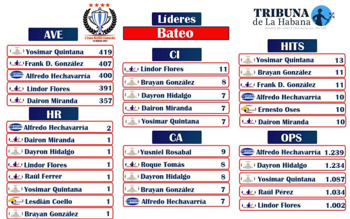 Así han destacado bateadores de Gran Habana como el todo terreno Yosimar Quintana (líder de bateo con 419 Ave y en hits con 13), el receptor Brayan González (entre los primeros en casi todos los departamentos), y Dairon Hidalgo, un pelotero de 27 años de fuerza al bate que se le ha escapado a los técnicos durante varios años.