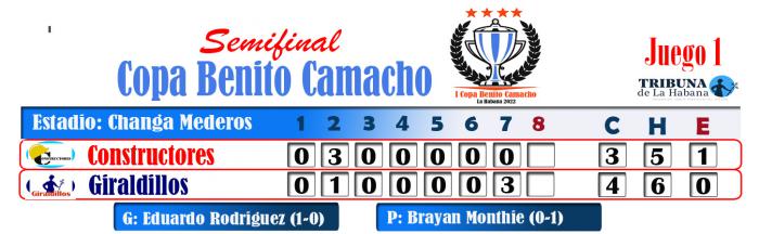 En un partido de altas tensiones, los Giraldillos dejaron tendidos en el césped del Changa Mederos de la Ciudad Deportiva a los muchachos de Constructores 4-3, en el primer duelo del playoff semifinal de la Copa Benito Camacho “In Memoriam”.