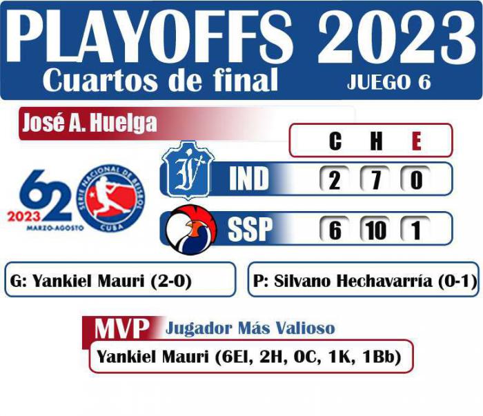 Los Gallos de Sancti Spíritus, arrinconados en su valla del José Antonio Huelga, picaron a los Leones de Industriales hasta vencerlos 6-2, para igualar el playoff de cuartos de final de esta Serie Nacional y forzar a un partido decisivo este lunes.