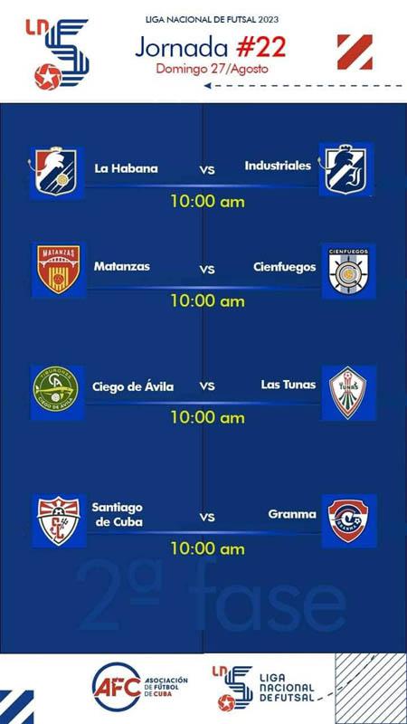 La actual Liga Nacional de Futsal sigue avanzando con los ocho mejores elencos de esta edición dentro de su segunda etapa que en estos días cumple una pausa por un microciclo que desarrolla la preselección nacional en la central provincia de Ciego de Ávila, donde se encuentran varios atletas capitalinos, entre ellos Dayan Cotilla, George Luis Gonzáles, los porteros Leonardo Hierrezuelo y Ariel Pérez Zayas, todos junto al técnico Freddy Juan Herrera. Esta base de entrenamiento que se extenderá hasta el 24 de agosto está destinada a mantener el seguimiento de los jugadores con vistas al proceso de clasificación mundialista que comenzará en 2024.