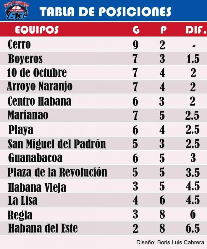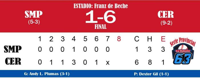 El equipo Cerro salió victorioso este jueves en la 63 Serie Provincial de Béisbol de La Habana y se afincó en la primera posición de la tabla de posiciones, cuando solo le resta tres partidos para finalizar la fase clasificatoria.