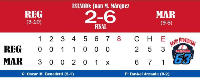Marianao también le puso fin a su actuación en esta fase al golpear al débil Regla 5-2, resultado que los dejó solos en el tercer escaño con foja de 9-5 y grandes posibilidades de pasar a la postemporada.