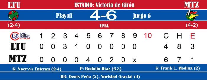 Por los derrotados Denis Peña (4-1) conectó un vuelacercas solitario y Yuniesky Larduet se fue de 5-2 con una empujada.