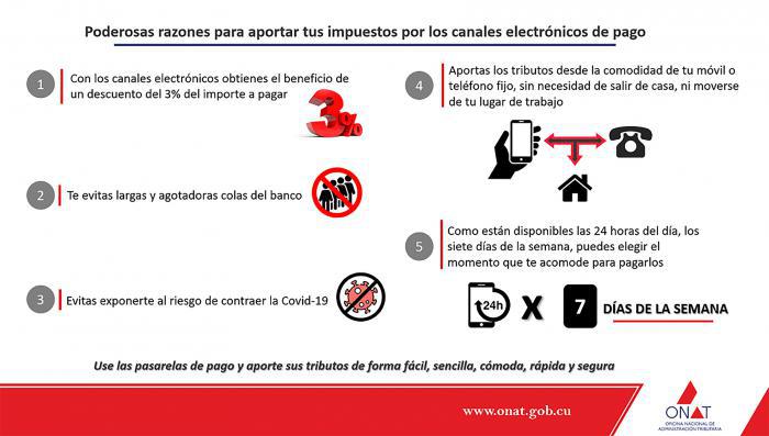 Según el sitio web de la ONAT, si aportas los tributos mediante los canales electrónicos Transfermóvil, Telebanca, los cajeros automáticos, la Banca Remota, tanto del Banco de Crédito y Comercio (Bandec) como del Banco Popular de Ahorro (BPA), el importe a pagar por las obligaciones fiscales será un 3 % menor.