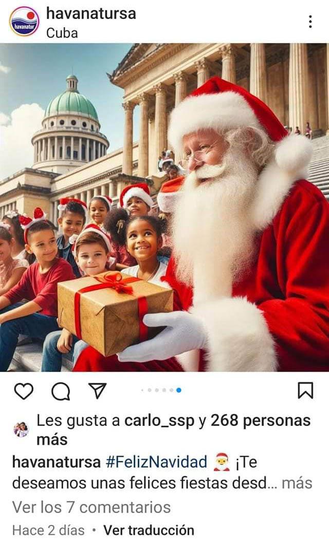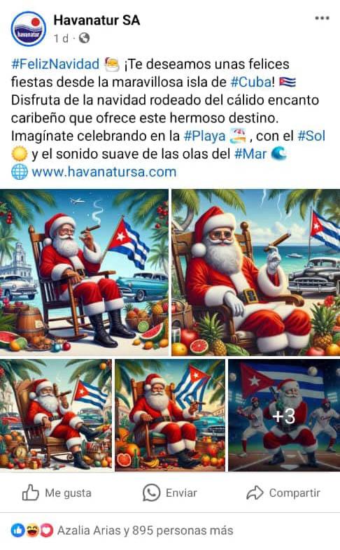 Han pasado unos días, pero no mi sorpresa e indignación por unas desconcertantes e indefendibles propagandas (en plural, porque fueron varias) publicadas por Havanatur SA, en las que se coloca a un ridículo "Papá Noel", hecho al parecer con tecnología de Inteligencia Artificial (aunque carente de inteligencia esencial), en función de promover el destino turístico cubano.