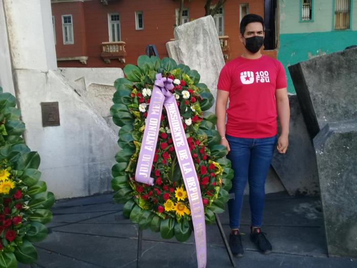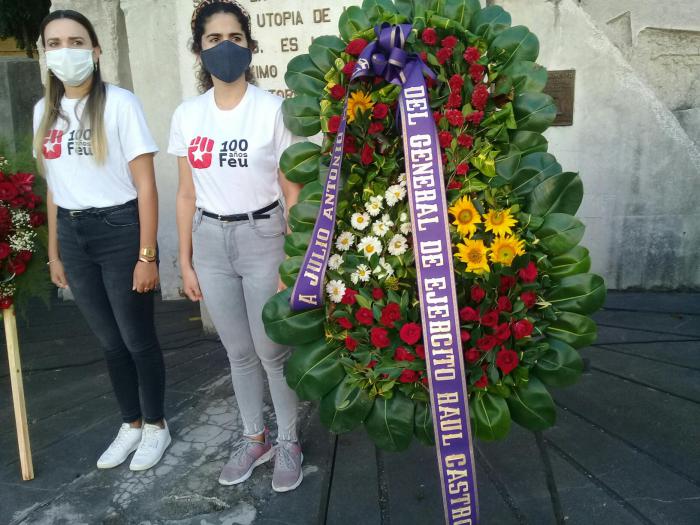 Ofrendas florales del General de Ejército Raúl Castro Ruz, del Primer Secretario del Comité Central del Partido Comunista de Cuba y Presidente de la República Miguel Díaz-Canel Bermúdez, del Consejo de Estado y de Ministros, y de la Universidad de La Habana, fueron colocadas este lunes, como parte del homenaje de la Federación Estudiantil Universitaria ( FEU), al líder estudiantil y revolucionario Julio Antonio Mella, en el aniversario 93 de su asesinato en México por la tiranía de Gerardo Machado.