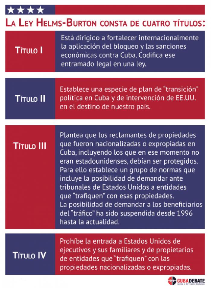 La medida, cuyo alcance extraterritorial afecta intereses legítimos de terceros países, fue diseñada para entorpecer la creciente inversión extranjera en Cuba tras la caída del campo socialista y la Unión Soviética a principios de los años 90.