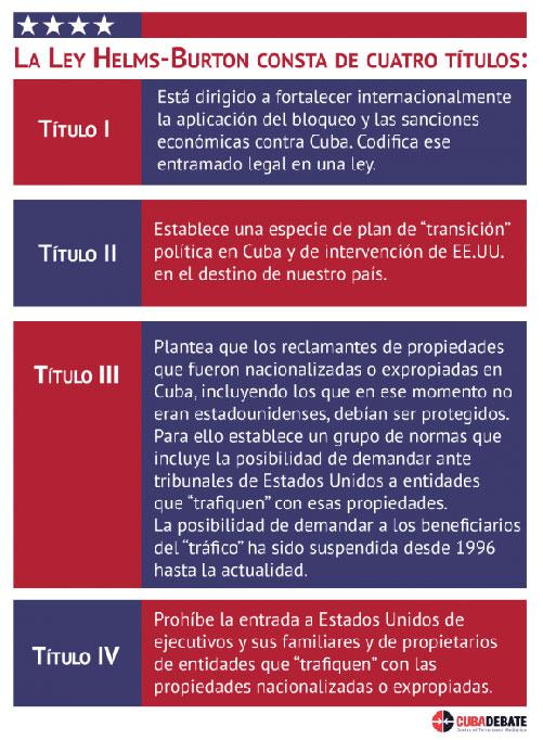 Desde el 2 de mayo el referido capítulo abre la posibilidad de que cortes del país norteño acojan reclamaciones contra empresas cubanas y extranjeras, bajo el argumento de que "trafican" con supuestas propiedades estadounidenses que el Gobierno de la mayor de las Antillas nacionalizó en 1959.