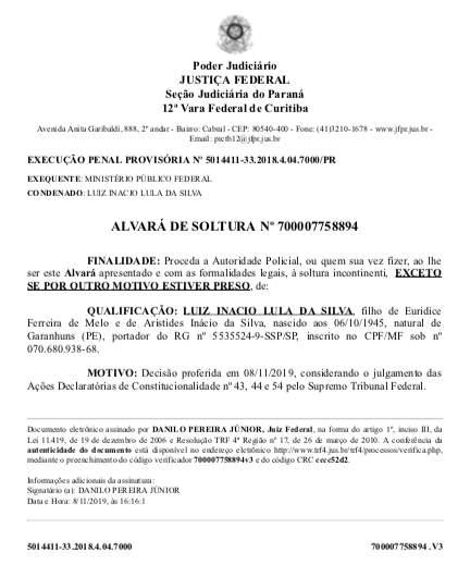 Documento firmado por el juez ordenando la inmediata libertad de Lula:
