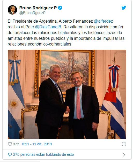 Sobre las 9:30 de la mañana de este miércoles 11 de diciembre, el presidente argentino Alberto Fernández, recibió en Casa Rosada al mandatario cubano Miguel Díaz-Canel Bermúdez y al canciller Bruno Rodríguez Parrilla, durante poco más de media hora.