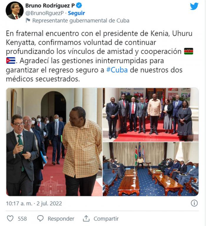 Al ser recibido por el presidente de Kenia, Uhuru Kenyatta, el ministro de Relaciones Exteriores de Cuba, Bruno Rodríguez Parrilla, agradeció las gestiones ininterrumpidas para garantizar el regreso seguro a Cuba de los dos médicos antillanos secuestrados en esa nación de África del Este, detalló en un tuit.
