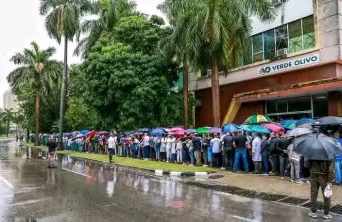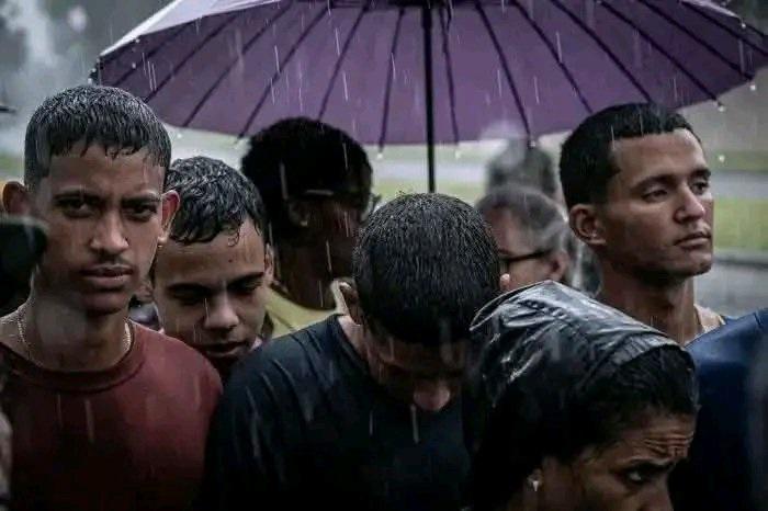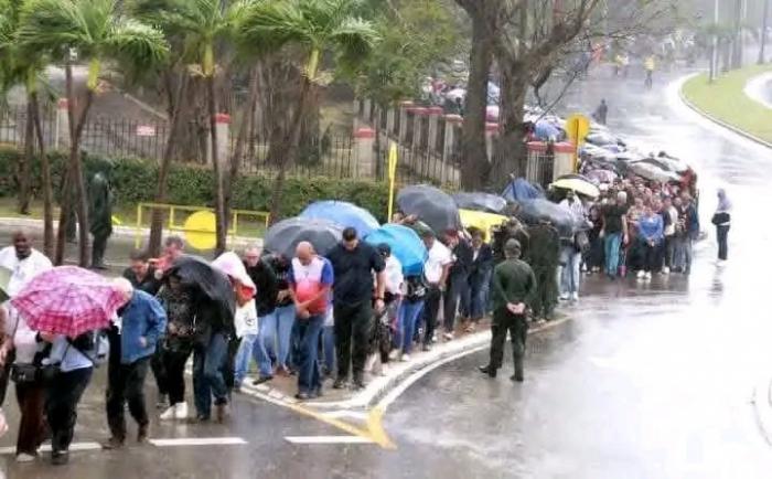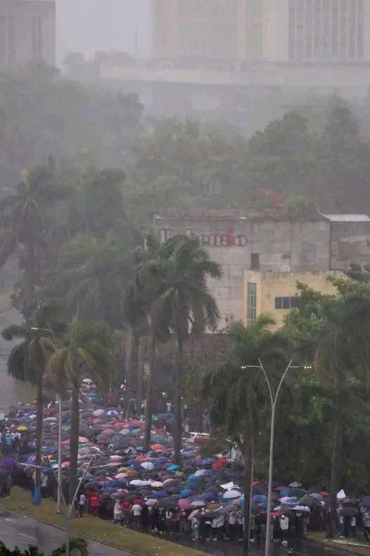 Cada una de las personas allí presentes, de todas las edades, procedencias, credos religiosos, colores de piel, profesiones... tendría - estoy segura - su propia historia para contar, su propio dolor, su rabia, su luto, su forma de expresar sus condolencias o las ganas de mandar bien lejos a los imperialistas. Lo que sí puedo asegurar es que parecía que hasta la naturaleza necesitaba llorar, o por el contrario, pareciera tener una rabia tal que toda su fuerza acumulada en lluvia debía dispararla contra los que allí estuviéramos SÍ o SÍ, porque no había de otra. Hoy había que estar allí. Y estuvieron personas en muletas, parejas de abuelitos de casi 90 años que no oian o caminaban bien y habia que ayudarlos; entre los grupos apretados de personas habia Ministros, cuadros, trabajadores de los mas inimaginables sectores, familias con sus hijos pequeños o adolescentes. Y cuando la lluvia arreció descomunalmente, sin cesar y a pesar del frío, las sombrillas se multiplicaron y unos a otros se arropaban y abrigaban - aun sin conocerse - y hubo quienes hasta café repartieron, mientras otros olvidaban los dolores causados por las secuelas de casi tres meses con Chikungunya, las inflamaciones ya a la vista y aunque salieron de allí caminando con dificultades y seguros de empeorar por unos dias, convencidos estaban de la importancia de haber estado allí.