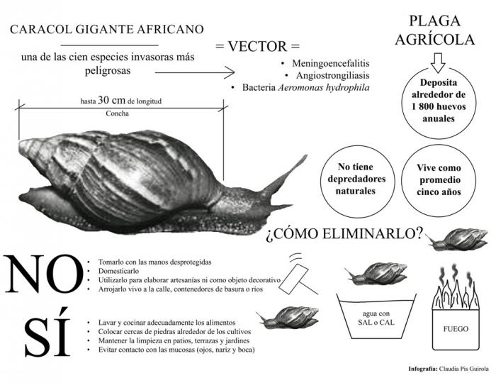 Es el caracol gigante africano (Lissachatina fulica), una de las 100 especies invasoras más dañinas del mundo pues es vector de varias enfermedades letales para los humanos entre las que se encuentran la meningoencefalitis, aunque cabe destacar que, hasta el momento, no se ha presentado ningún caso en Cuba por esa causa.