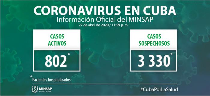 Al cierre del día de ayer, 27 de abril, se encuentran ingresados en hospitales para vigilancia clínico epidemiológica 3 mil 330 pacientes. Otras 6 mil 742 personas se vigilan en sus hogares, desde la Atención Primaria de Salud.