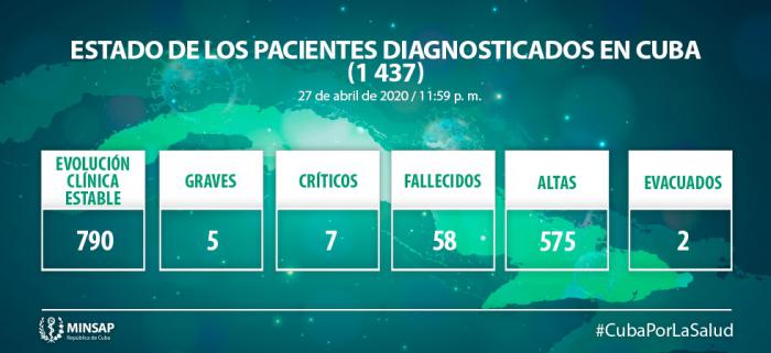 Ciudadano cubano de 38 años de edad, residente en el municipio Cienfuegos, provincia del mismo nombre. Contacto de caso confirmado anteriormente. Se mantienen en vigilancia 81 contactos.