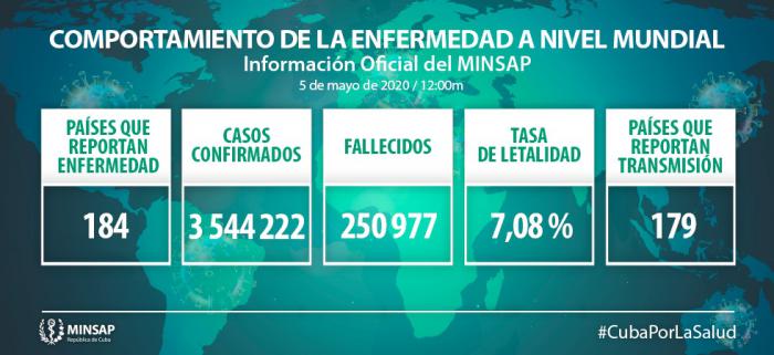 Hasta el 5 de mayo se reportan 184 países con casos de COVID-19 con 3 millones 544 mil 222 casos confirmados (+ 76 mil 901) y 250 mil 977 fallecidos (+ 3 mil 998) para una letalidad de 7,08 % (-0,04).