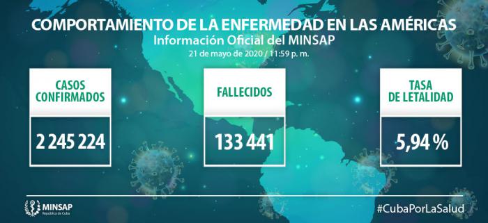 En la región de las Américas se reportan 2 millones 245 mil 224 casos confirmados (+ 58 mil 317), el 45,26% del total de casos reportados en el mundo, con 133 mil 441 fallecidos (+ 3 mil 761) y una letalidad de 5,94% (+0,01).
