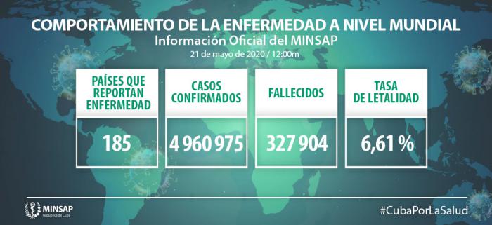 Hasta el 21 de mayo se reportan 185 países con casos de COVID-19, con 4 millones 960 mil 975 casos confirmados (+ 99 mil 519) y 327 mil 904 fallecidos (+ 5 mil 421) con una letalidad de 6,61% (-0,02).