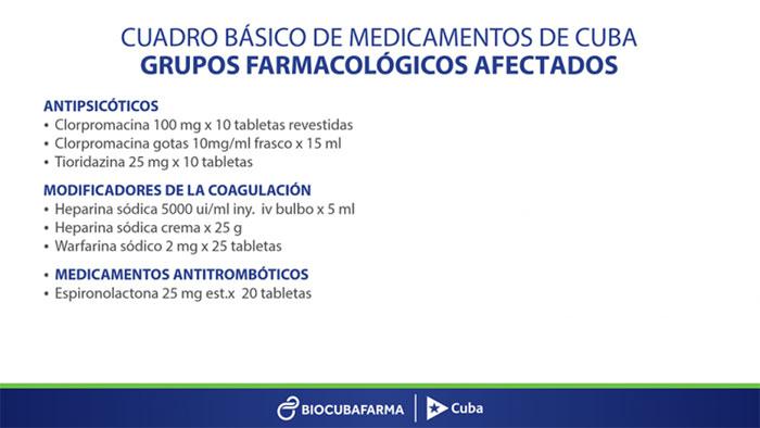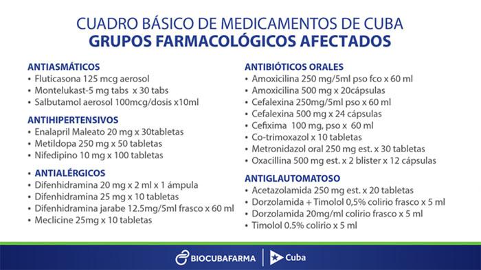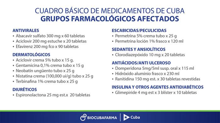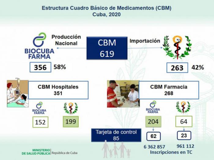 El cuadro básico de medicamentos en Cuba para este año está constituido por 619 renglones, de ellos 263 (42%) son importados por el Minsap y 356 (58%) lo produce la industria nacional: 350 BioCubaFrama, cinco la industria alimentaria y uno el CENSA.