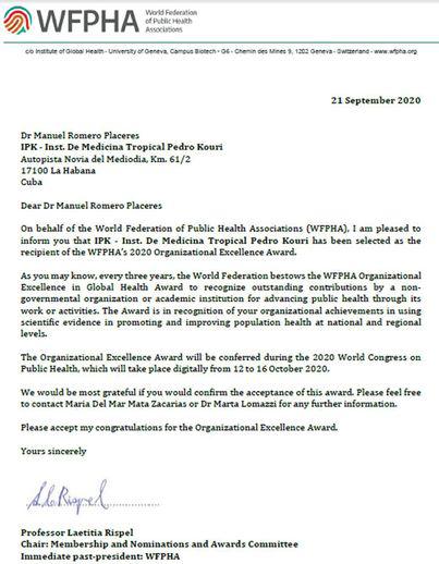 Según publicó la institución científica, el importante galardón se trata de un justo reconocimiento “a la labor que en el campo de la salud pública y la medicina realizan los trabajadores de esta prestigiosa entidad, al igual que lo hacen miles de hermanos en los diferentes países de nuestra Región”.