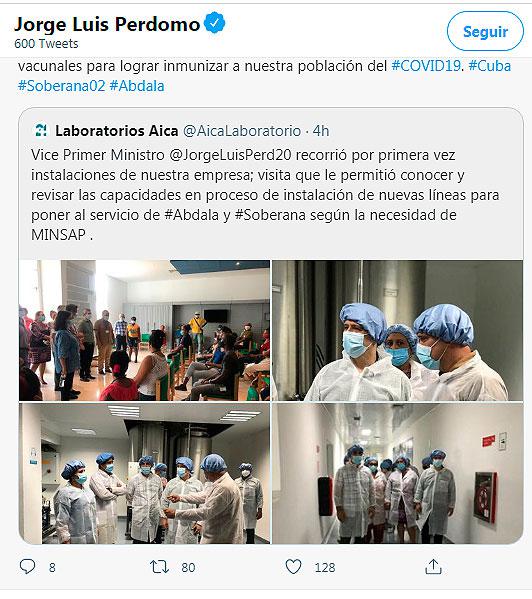 descanso en el desarrollo y la producción de los candidatos vacunales para lograr inmunizar a nuestra población del #COVID19. #Cuba #Soberana02 #Abdala”, escribió Perdomo.