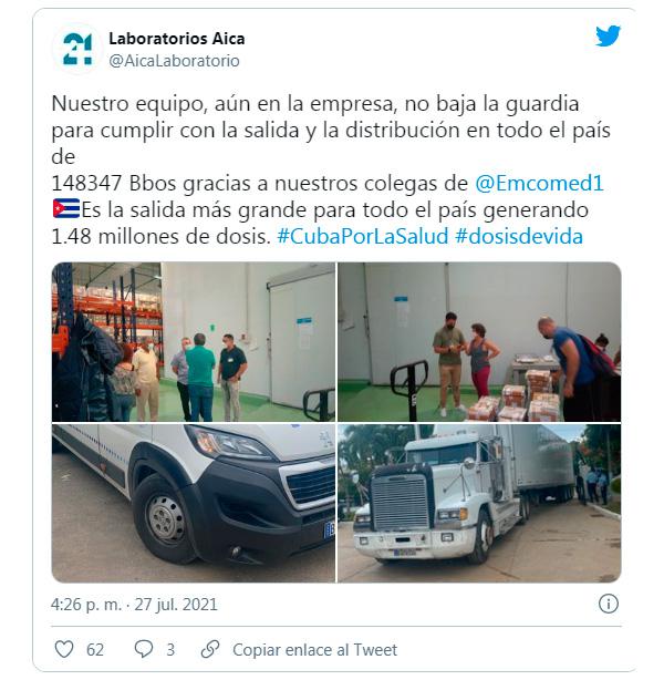 "Nuestro equipo, aún en la empresa, no baja la guardia para cumplir con la salida y la distribución en todo el país de 148347 Bbos gracias a nuestros colegas de @Emcomed1 es la salida más grande para todo el país generando 1.48 millones de dosis. #CubaPorLaSalud #dosisdevida", tuiteó la empresa.
