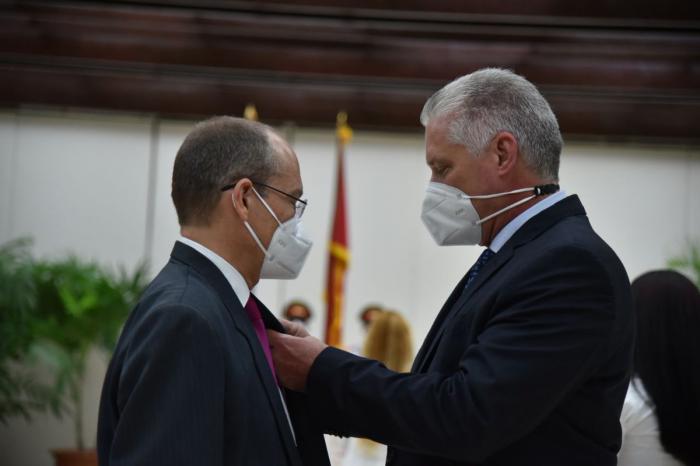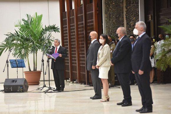 Esta noche Cuba les agradece una vez más. En el Salón de Protocolo del Consejo de Estado “El Laguito” en La Habana, el primer secretario del Comité Central del PCC y presidente, Miguel Díaz-Canel Bermúdez, le concede el título de Héroe del Trabajo de la República de Cuba a 10 eminentes científicos detrás de la producción de las tres vacunas y los dos candidatos vacunales cubanos contra la covid-19.