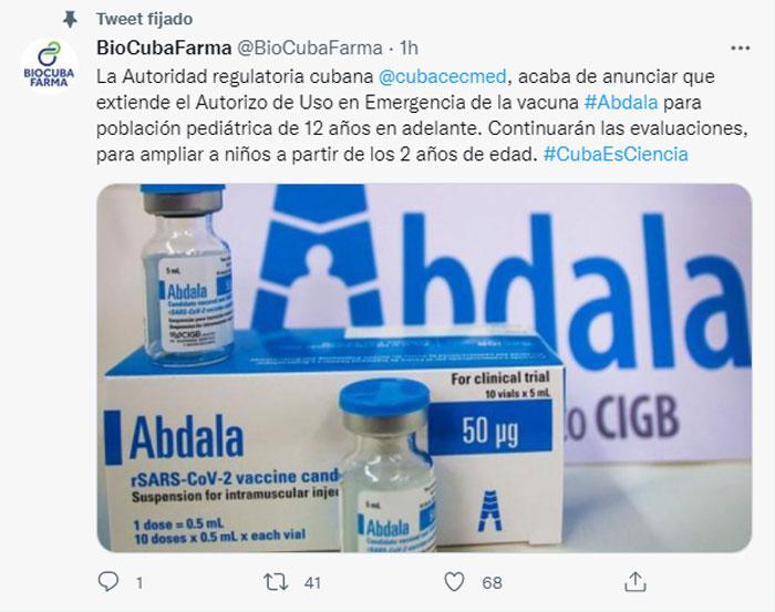 El Centro para el Control Estatal de Medicamentos, Equipos y Dispositivos Médicos (CECMED) decidió en el día de hoy, aprobar la Autorización de Uso en Emergencia (AUE) a la vacuna cubana ABDALA 50 µg, cuyo titular es el Centro de Ingeniería Genética y Biotecnología (CIGB), en la indicación para población pediátrica en edades comprendidas entre los 12 a 18 años, con un esquema de 3 dosis de 0.5 mL y un intervalo de 14 días entre cada aplicación, conforme a lo dispuesto en las regulaciones y disposiciones vigentes, una vez que se ha demostrado que cumple con los requisitos exigidos en cuanto a calidad, seguridad y eficacia para este grupo poblacional.