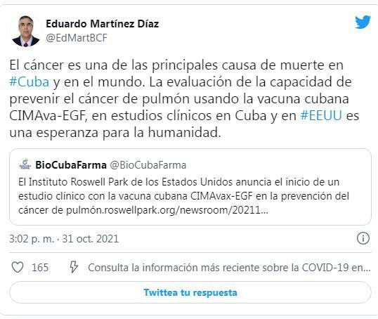 Al respecto, el presidente de BioCubaFarma, DrC. Eduardo Martínez Díaz, refirió en su Twitter: