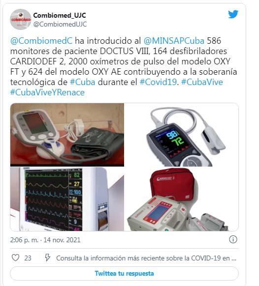 “@CombiomedC ha introducido al @MINSAPCuba 586 monitores de paciente DOCTUS VIII, 164 desfibriladores CARDIODEF 2, 2000 oxímetros de pulso del modelo OXY FT y 624 del modelo OXY AE contribuyendo a la soberanía tecnológica de #Cuba durante el #Covid19. #CubaVive #CubaViveYRenace”.