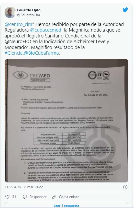 El director general del CIM, Eduardo Ojito, señaló en la misma red social que este constituye un magnífico resultado de la ciencia cubana.
