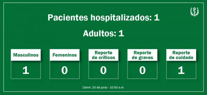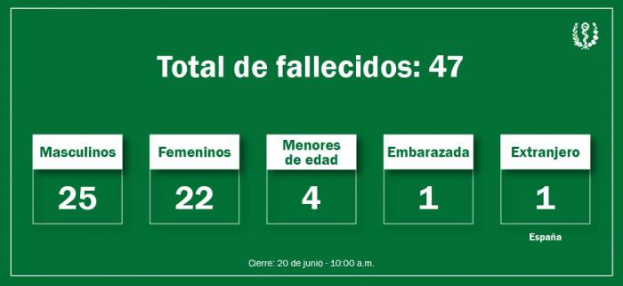 Hasta las 10:00 a. m. del 20 de junio se mantiene la misma información de la jornada anterior. Resultaron lesionadas 99 personas, de ellas 1 se encuentra hospitalizada, 51 pacientes recibieron el alta médica y 47 fallecieron.