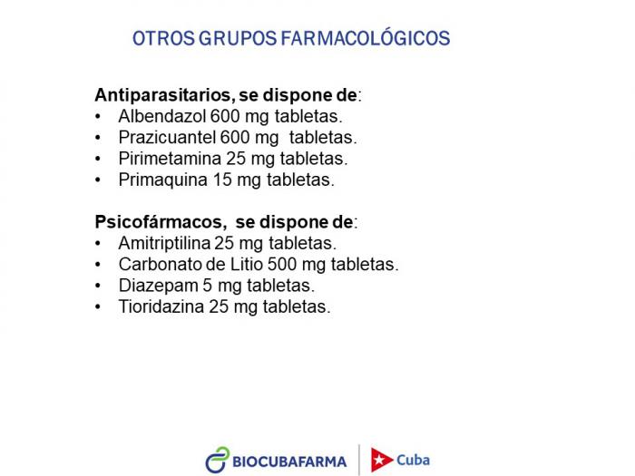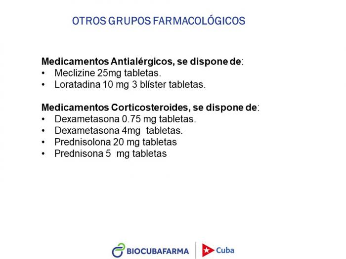 En el caso de los medicamentos y vacunas, el cuadro básico está integrado por 627 medicamentos y vacunas en general, de los cuales el 60% (369) son suministrados por BioCubaFarma, tanto genéricos como innovadores y creados en centros del sector biotecnológico y farmacéutico del país.
