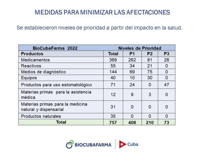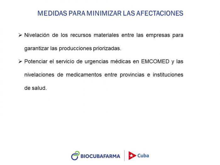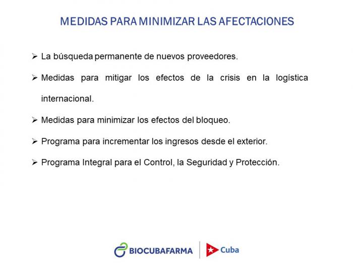 En ese escenario –continuó la vicepresidenta de BioCubaFarma–, “hemos tomado medidas para enfrentar la situación tan compleja. Se han tomado medidas operativas, otras con efecto a mediano y largo plazo, y otras que ya estaban implementadas, pero sobre las que ahora hay un mayor control, con el objetivo de minimizar el tiempo de arribo de las materias primas al país y disminuir las afectaciones en el sistema nacional de salud”.