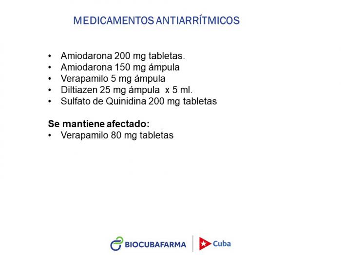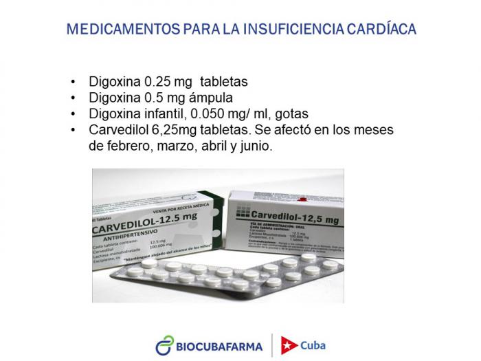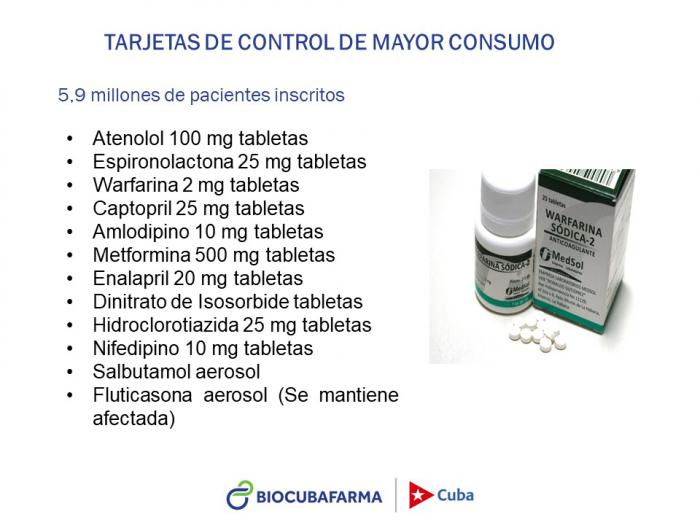 Precisó que dentro de estos medicamentos, hay 12 de mayor consumo. Hay casi seis millones de cubanos inscritos en tarjetones de estos 12 medicamentos (cinco antihipertensivos, dos diuréticos, un anticoagulante, la metformina para la diabetes, dinitrato de isosorbida para la insuficiencia cardíaca y dos aerosoles para el asma: salbutamol y fluticasona).