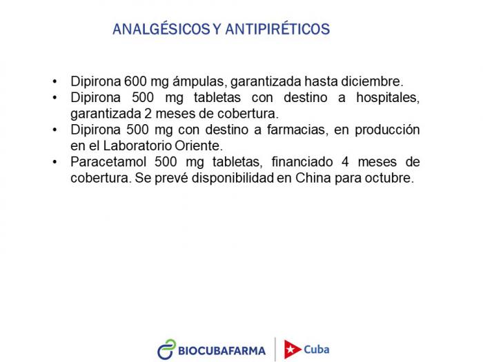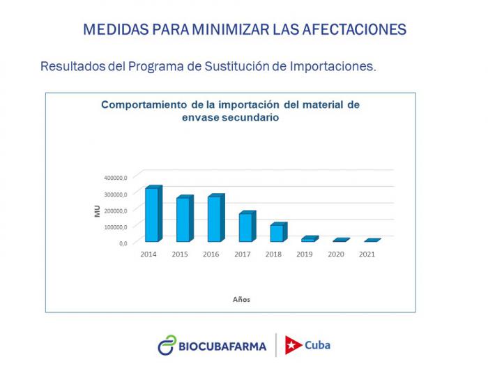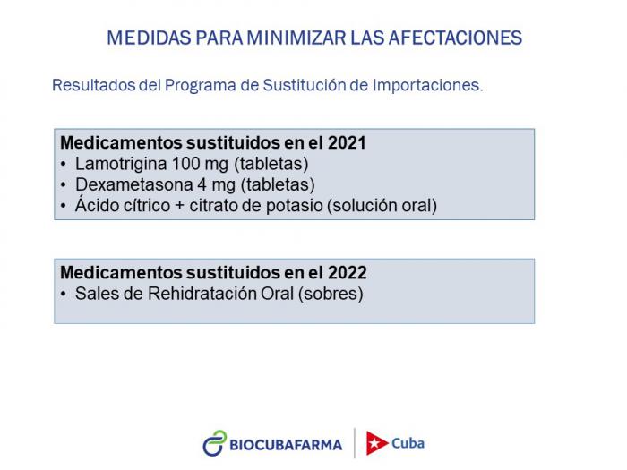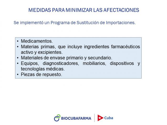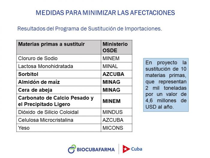 La vicepresidente de BioCubaFarma informó que hay un programa de sustitución de importaciones hasta el 2030, que abarca medicamentos, materias primas (IFA y excipientes), materiales de envase primario y secundario, equipos, diagnosticadores, mobiliarios, dispositivos y tecnologías médicas y piezas de repuesto.