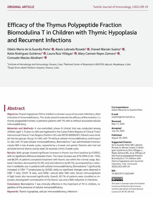 La revista Turkish Journal of Immunology publicó un estudio donde especialistas cubanos demuestran que la Biomodulina T puede ser altamente eficaz en niños con problemas del timo.