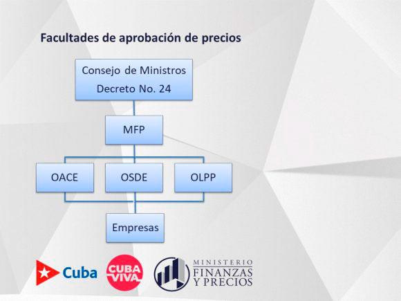 Según explicó el viceministro del MFP, ese decreto también define que en el caso de los productos cuya aprobación no corresponde al Consejo de Ministros, será facultad del Ministerio de Finanzas y Precios o de las autoridades en que este delegue (titulares de organismos de la Administración Central del Estado, institutos nacionales, consejos provinciales, empresas, unidades económicas de base).
