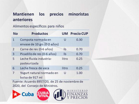 Los productos que integran esas dietas –subrayó– mantienen los mismos precios y un nivel de subsidio importante. Asimismo, mantienen los precios minoristas anteriores alimentos específicos para niños, incluidos compotas, carne de res, leche fluida, picadillo de res y yogurt.