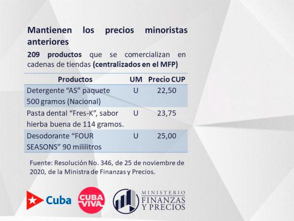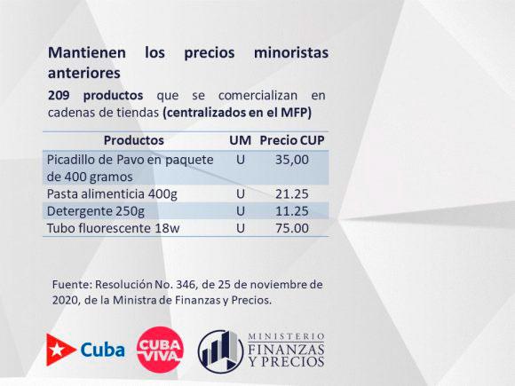 “No solo no suben los precios de las cadenas que antes vendían en CUC y ahora en CUP, aun entendiendo las limitaciones que hoy tenemos en las ofertas, sino que buena parte de estos productos que están en el entorno de 209 renglones se quedaron centralizados en el MFP, lo cual demuestra el sentido de protección del Estado hacia la población”.