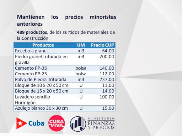 Por otra parte, 489 productos dentro de los materiales de la construcción, de venta liberada, mantienen sus precios minoristas anteriores. Entre ellos están el cemento gris, mortero, bloques, jaboneras, mantas impermeables, entre otros.