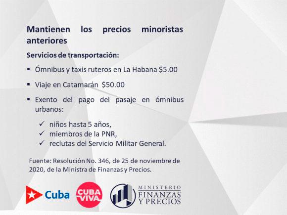 “Es el caso del transporte obrero, de alto impacto para la población, el cual estaba regulado por la Resolución 315 de nuestro ministerio, con una tarifa (la más generalizada) según la cual se estipulaba que por pasajero-kilómetro se aplicara 0.25 pesos. Después de analizar el impacto en el cobro a los trabajadores y de haber conciliado a todas las instancias y por supuesto con la propia empresa, fue ajustada en una reducción de 30%. Entonces, sería de 0.17 pesos por pasajero-km en ómnibus de hasta 40 pasajeros.